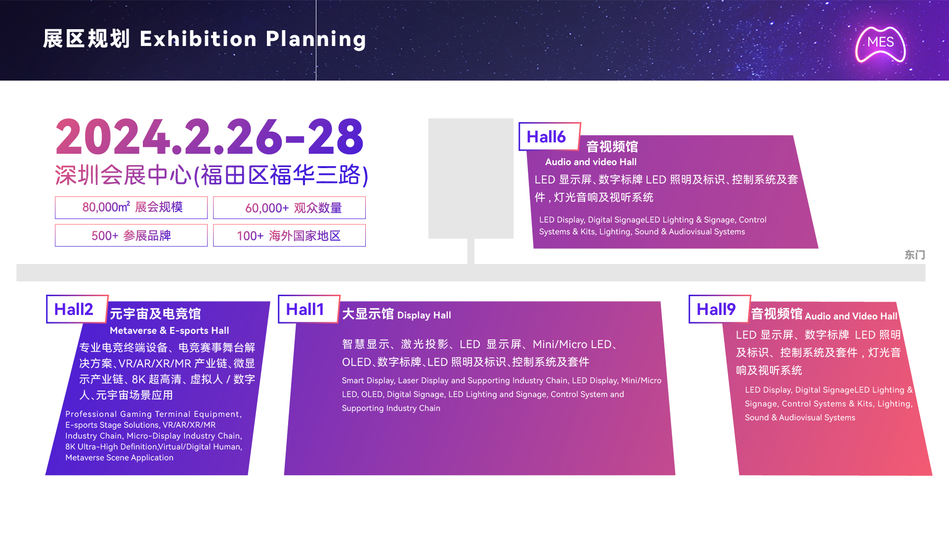 MES2024 国际元宇宙及电竞娱乐博览会与UDE2024 第五届国际半导体显示博览会、第21 届深圳国际LED 展(LED CHINA 2024)、2024 亚洲专业灯光音响展(Professional Audio, Lighting & Systems Show Asia 2024)、2024 国际音视频智慧集成展(深圳)同期举办,是国际“声光视讯显”全产业链产品的延伸——屏联万物,以屏显为主导,打造集商业显示、激光投影、LED 显示屏、灯光音响、视听系统集成、数字标牌、半导体材料设备、新型显示技术、硅基微显示、VR、AR、XR、MR、3D、数字孪生、人工智能、空间交互等一切元宇宙及电竞娱乐活动及赛事所使用的各种设备和配套产品。